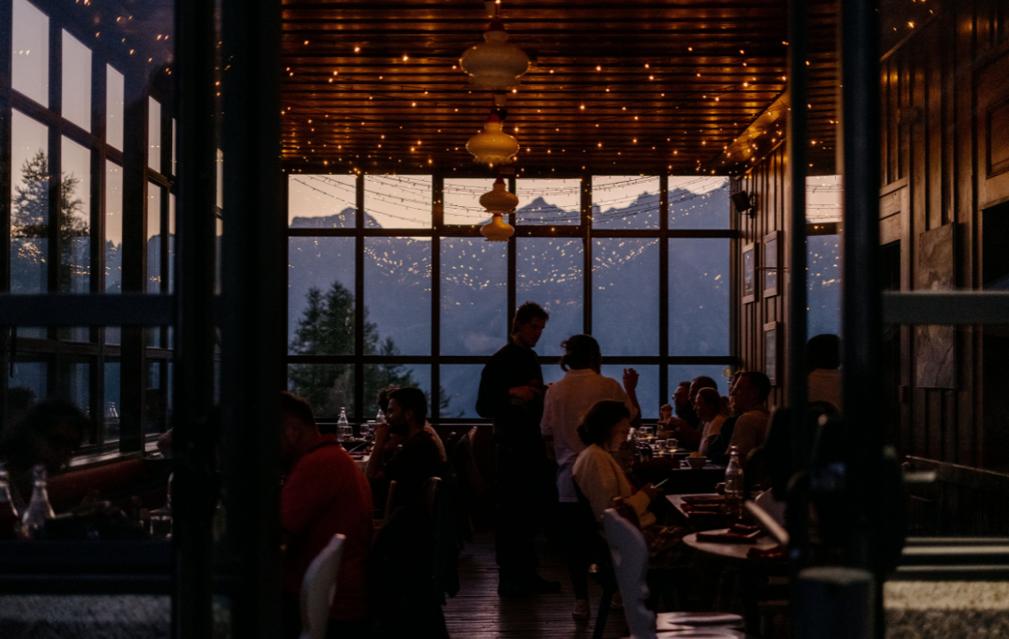 The recently renovated restaurant retains all its charm: a majestic terrace, a breathtaking panorama and a refined ambience inspired by the icy hues of the Massif.